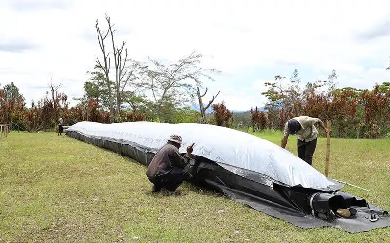 La sécheuse à bulles GrainPro est une sécheuse de type tunnel conçue pour sécher les produits agricoles tout en les protégeant contre les pluies soudaines et les conditions météorologiques imprévisibles. À l’aide d’air chauffé, la teneur en humidité des marchandises est vaporisée et poussée par les ventilateurs vers le fond.